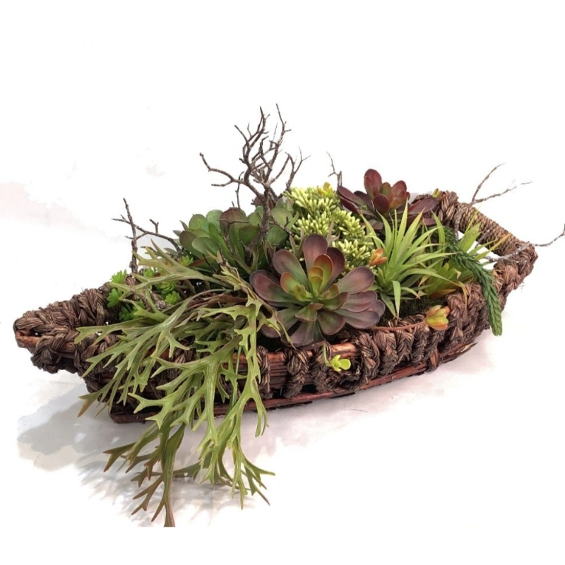 Añade un toque náutico a tu decoración con nuestra base de mimbre tipo barco de 50x25cm, con 8 suculentas grandes, musgo nativo y espuma floral Sahara.