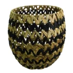 Canasto grande de 43x35cm, tejido a mano con fibra de bambú y base metálica, ideal para complementar la decoración de tus espacios. Su diseño listado en color café lo hace perfecto para cubrir macetas u organizar objetos.