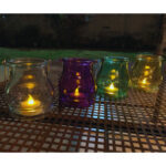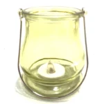 Candelabro de vidrio amarillo. ideal para usar en exterior, puesto que su vela no se apagará con viento. Además su luz es tan real como una vela normal. Pila no incluida.