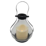 Candelabro metálico de 16 cm con vela LED ivory que simula una llama real. Resistente y seguro, perfecto para uso en exteriores o interiores. Funciona con 3 pilas AAA (no incluidas).