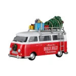 Figura Van Navideño, esta encantadora camioneta viaja por la ciudad cargada con un hermoso árbol navideño y regalos. Esta Van con su vibrante color rojo y adornos navideños crean un perfecto ambiente festivo para tu colección de villas.