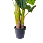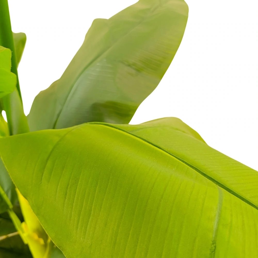 La Planta Banana de 1,8m es un complemento artificial que aporta naturalidad y frescura a tus espacios interiores sin necesidad de riego o abono. Solo requiere limpieza ocasional para mantener su brillo.