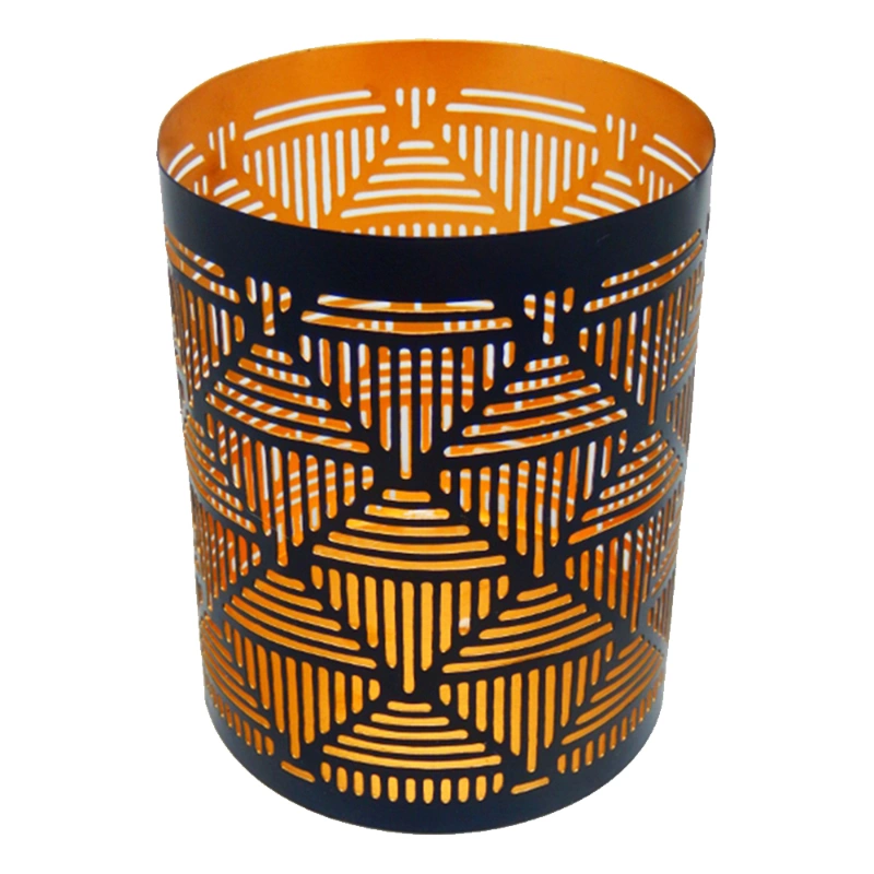 Porta Tealight Metalico tipo Huracan color Dorado, ideal para crear un ambiente sofisticado destacando por sus colores. Dimensiones 8x8x10cm