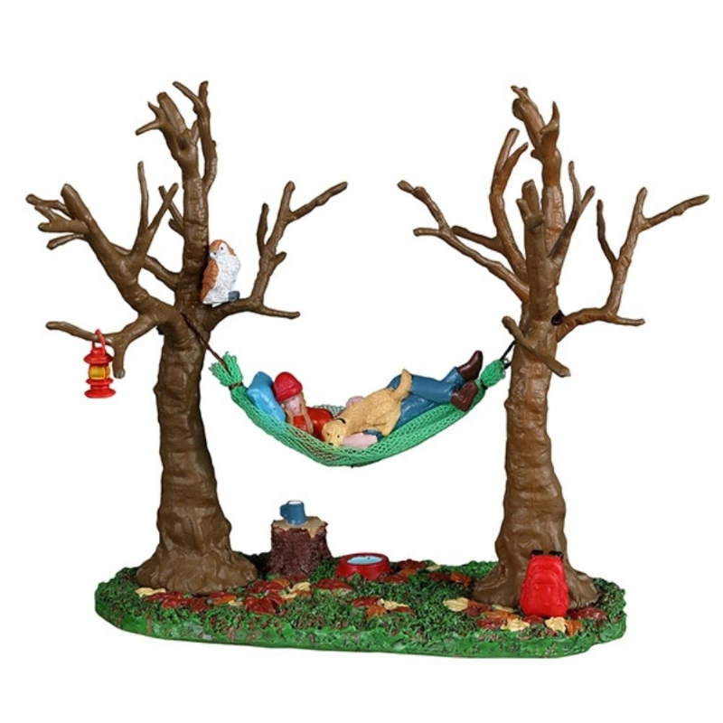 Stand coleccionable hecho con una combinacion de resina y ceramica, de una niña y su perro acampando en una hamaca. Ideal para contar historias tiernas y aventureras. Perfecta para quienes buscan añadir un toque de relajación y magia a sus decoraciones de camping.