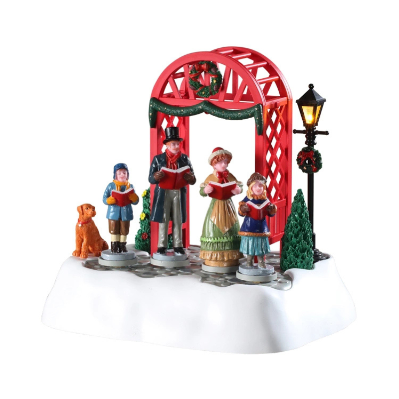 Stand Coro Navideño, coleccionable hecho con una combinacion de resina y ceramica, añade a tu colección de villas navideñas este encantador stand de coro navideño para darle una ambientación especial a tu colección. Este stand cuenta con iluminación y movimiento. Incluye cable USB para conexión y a su vez se puede conectar a pilas utilizando 3AA (pilas y transformador no incluido)