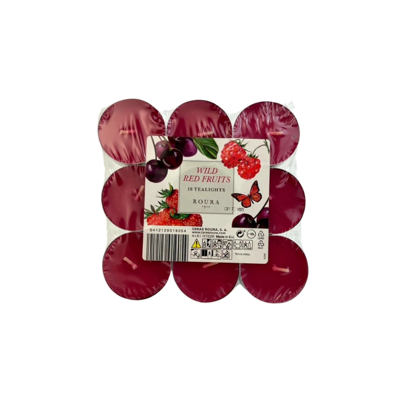 Pack de 18 tealights aromáticos con fragancia a frutos rojos, duración de ±4 horas cada uno. Ideal para decorar y aromatizar.