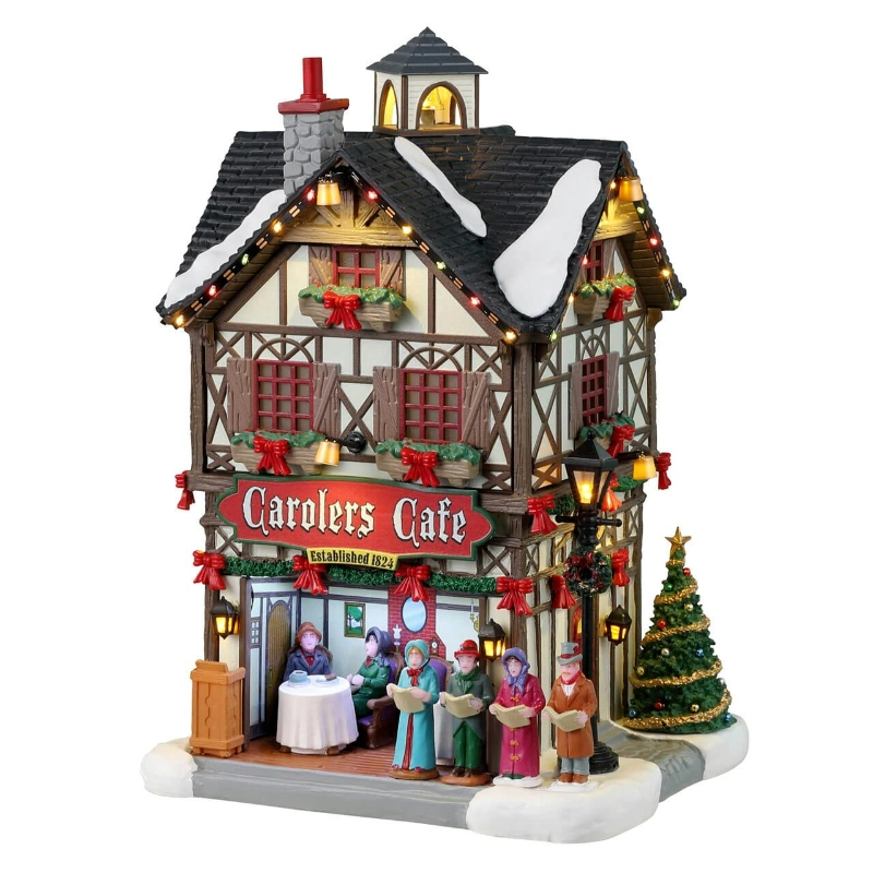 Cafetería Carolers hecho con una combinacion de resina y ceramica, un coleccionable encantador donde personajes se reúnen a cantar villancicos y disfrutar de la Navidad. Las luces iluminan todo el exterior del café, creando una atmósfera cálida y festiva. Incluye cable USB para conexión (transformador no incluido).
