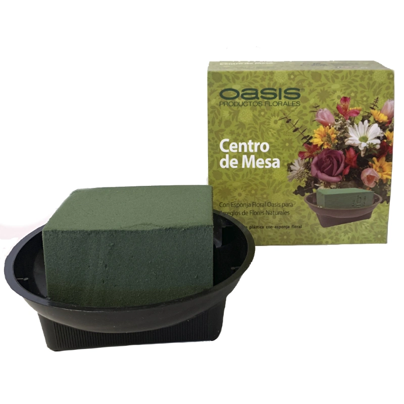 Centro de Mesa Oasis con espuma floral Deluxe y base plástica que previene escurrimientos. Viene con estuche protector para facilitar el traslado y mantener la espuma segura. Ideal para arreglos florales con soporte adicional.