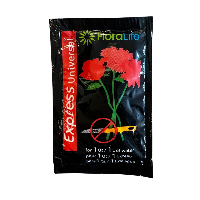 Adecuado para todos los tipos de flores, Express Universal 300 proporciona hidratación y nutrición para la flor fresca recién cortada, incluso si no recortas los tallos! Esta es nuestra tecnología Express. ¡No se requiere recortar el tallo! Modo de uso: Vierte el contenido de un sobre (5 gr) por cada medio litro de agua o utiliza la medida que viene dentro de la cubeta en la proporción que indiquen las instrucciones. Coloca las flores dentro del florero sin cortar el tallo.