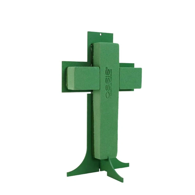 Cruz Oasis 31×21 cm con base de MDF resistente, ideal para arreglos funerales y eventos religiosos. Envuelta en película de polietileno verde que retarda la evaporación. Soporta flores desde cualquier ángulo y cuenta con perforaciones para colgar o sujetar.