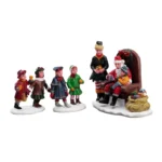 Recrea el clásico momento navideño con esta encantadora figura de niños esperando su turno para hablar con Santa Claus. Ideal para completar tu villa o escena navideña.