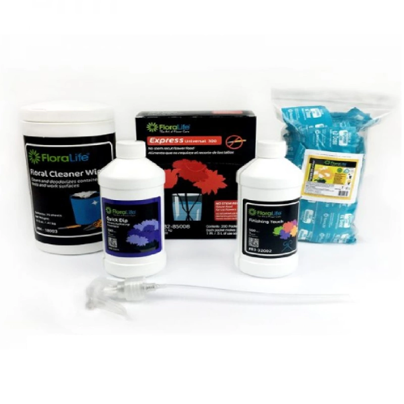 Kit completo de 5 pasos para el correcto tratamiento de flores de corte. Contiene 5 productos para garantizar la durabilidad de las flores desde su adquisición hasta la entrega al cliente. Está diseñado para ser utilizado por floristas, estudiantes y amas de casa que requieren soluciones completas para el tratamiento de sus flores. Contenido: Paso 1: Toallitas sanitizantes bote con 75 unidades (Limpia y desinfecta los recipientes, herramientas, manos y bases en los que será tratada la flor, garantizando un tratamiento libre de bacterias nocivas para ellas). Paso 2: Express 200 eZ Dose paquete con 40 unidades (Mantén las flores en buen estado durante su transportación y almacenaje en cuarto frío, la nueva tecnología Express de Floralife permite realizar este proceso sin necesidad de cortar los tallos antes de su tratamiento). Paso 3: 1 Quick Dip 100 de 500ml (Destapa los conductos de los tallos, permitiendo una hidratación total de las flores, aún si estas sufrieron deshidratación durante su transportación). Paso 4: 1 Finishing touch (Rocío para acabado final) de 500ml (El paso final después del diseño, mantiene la hidratación de las flores por más tiempo manteniéndolas en buen estado para el cliente). Paso 5: Caja de alimento floral Express Universal 300 paquete con 200 unidades para 5 litros cada una (Proporciona el alimento que las flores requieren alargando su vida en florero y en espuma floral, es perfecto para hidratar la espuma y para rehidratarla por perdida de agua).
