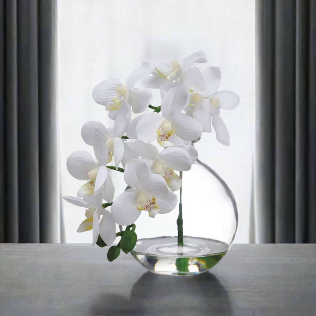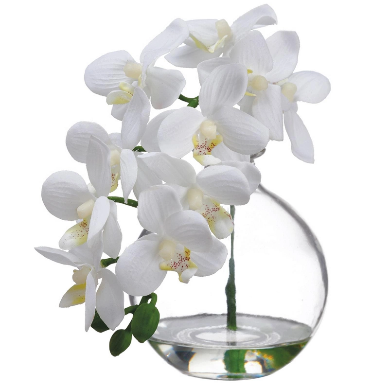Orquídea 25cm Blanca artificial le dará a tus decoraciones un brillo distinto, posee una base de vidrio perfecta para que coloques donde mas te guste!